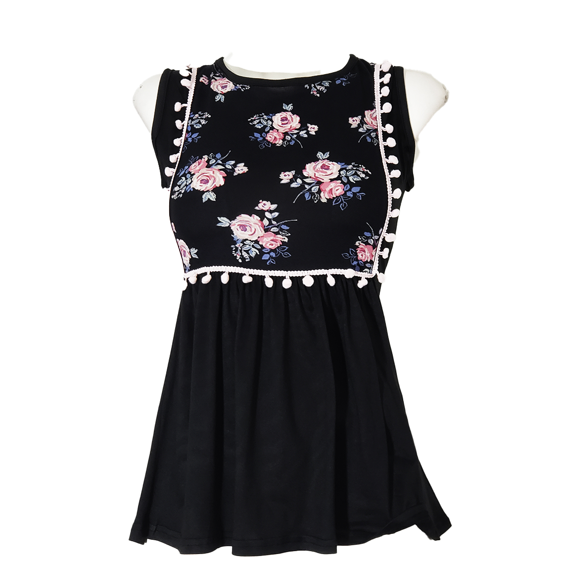 Blusa toscana estampado rosas con aplicacion de pompones , sin manga