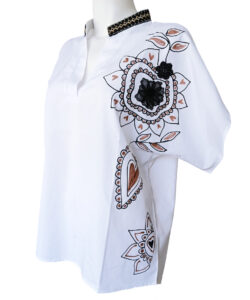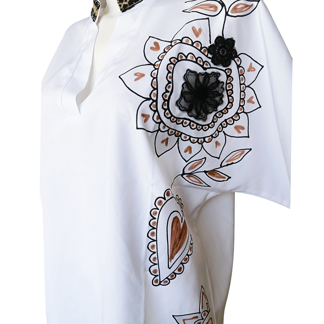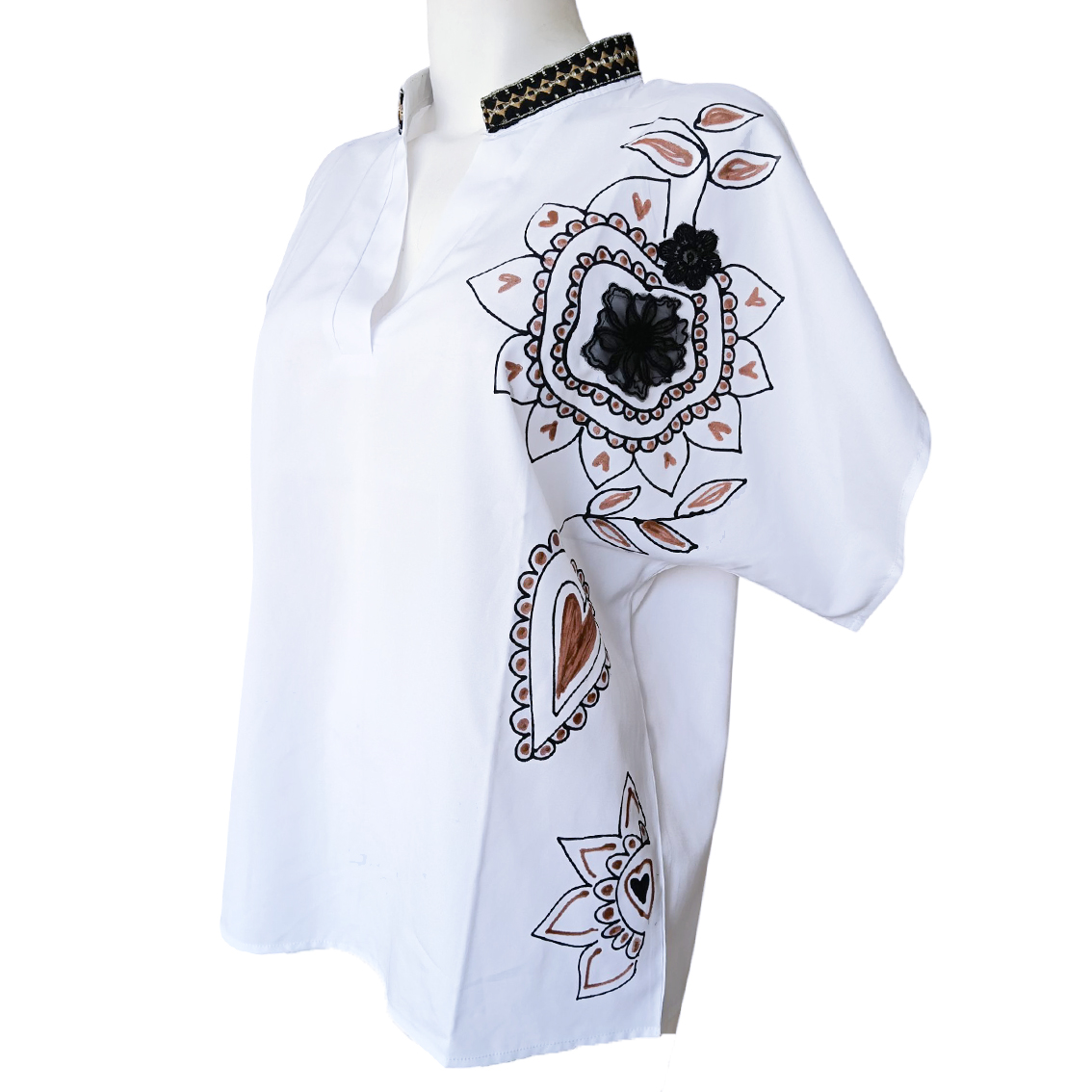 Pintada y bordada a mano.