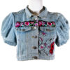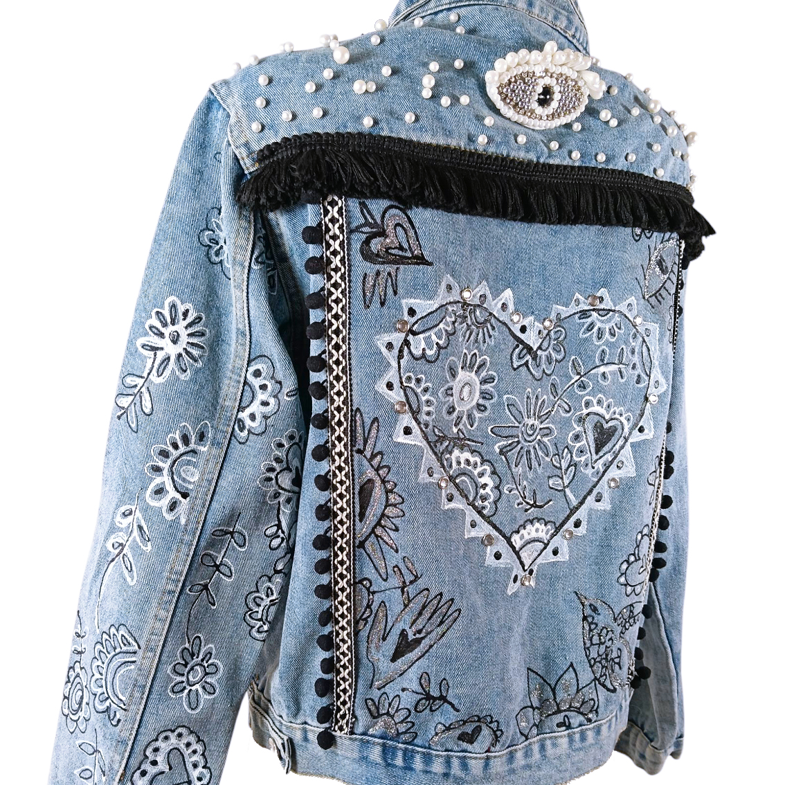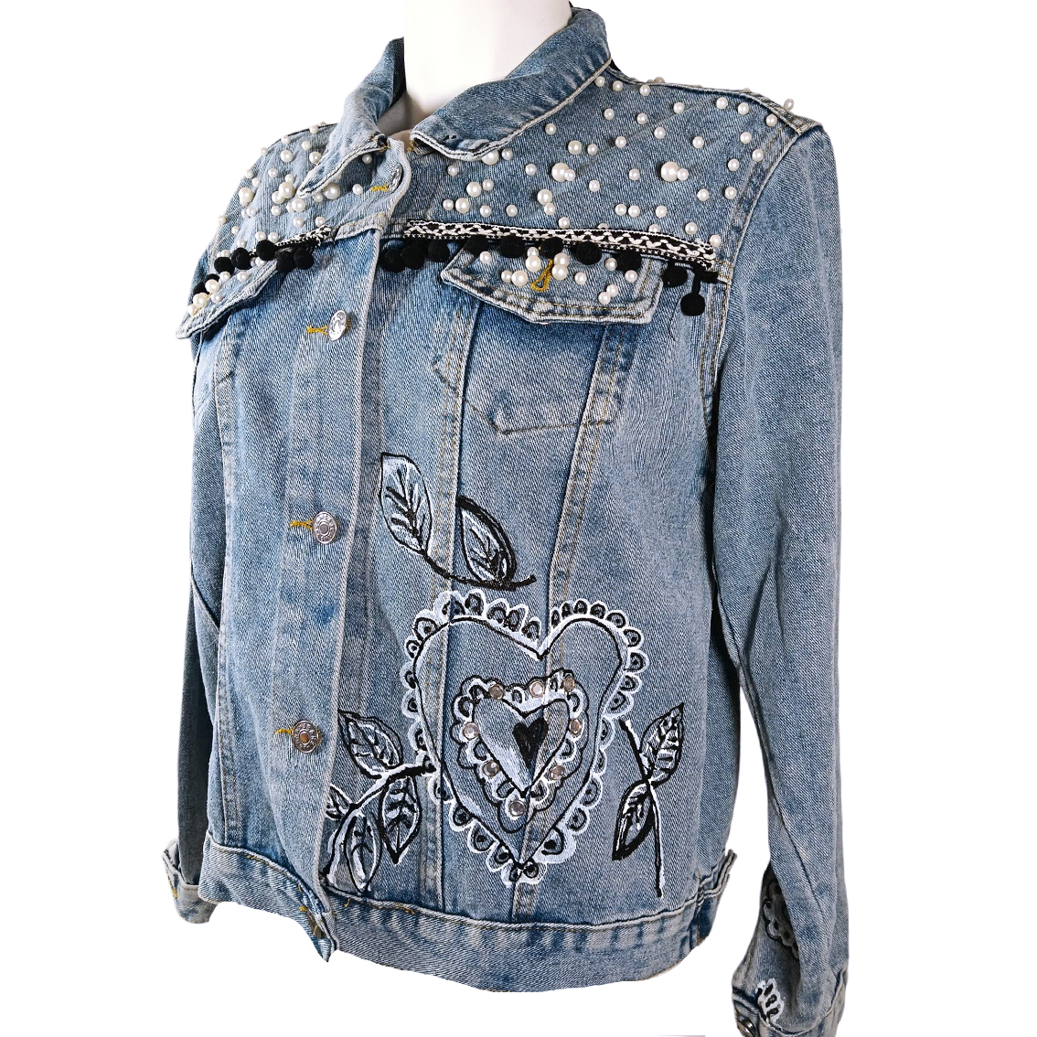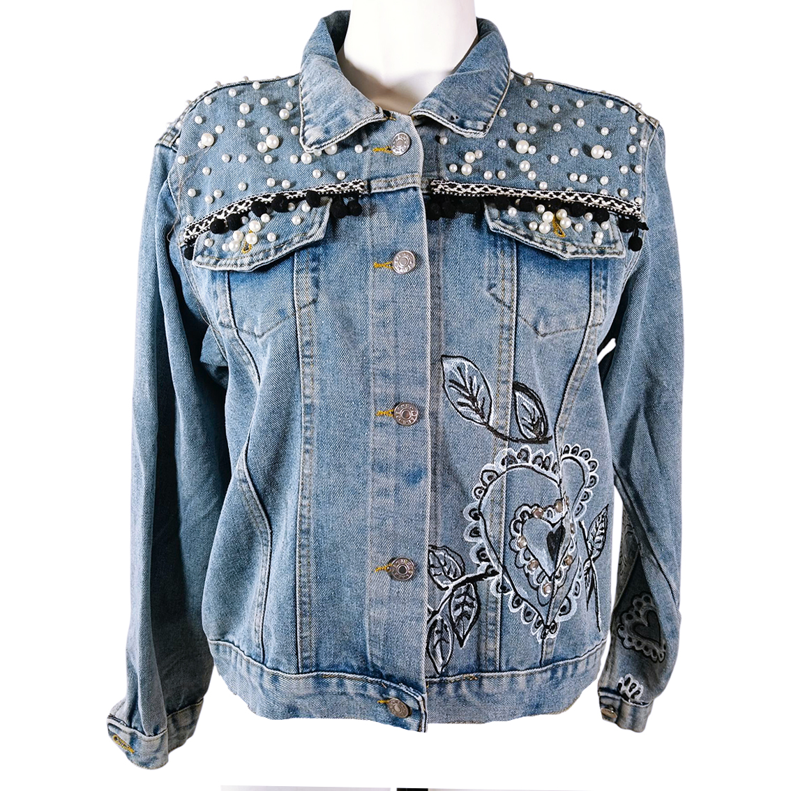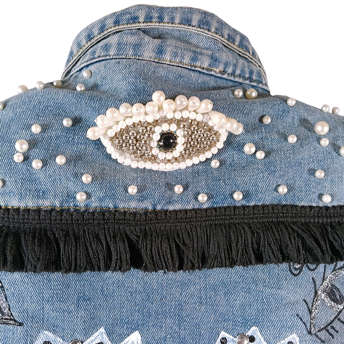 Aplicaciones bordadas y pintadas a mano.