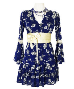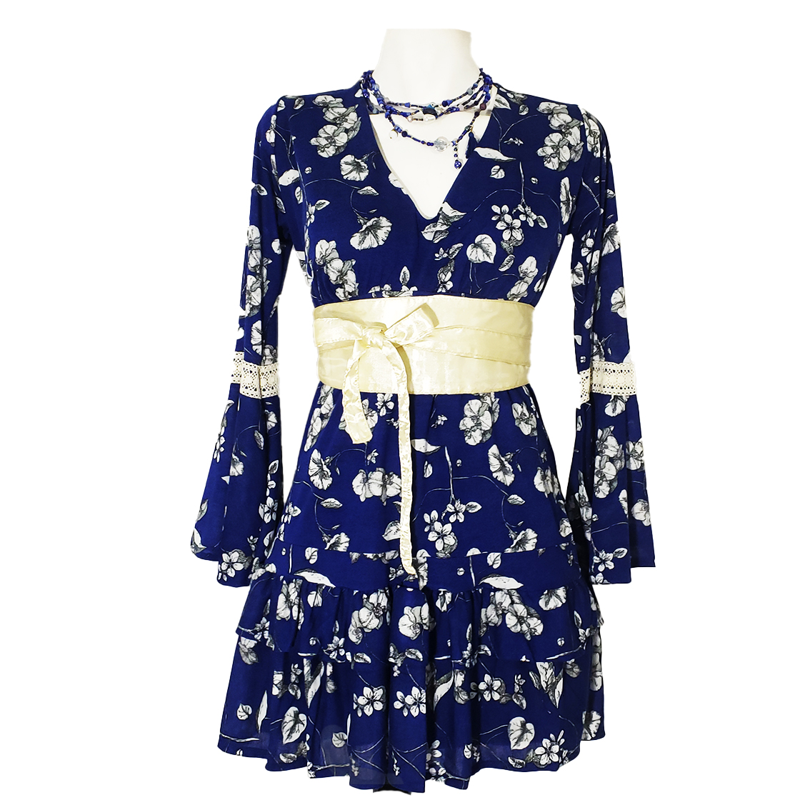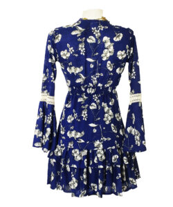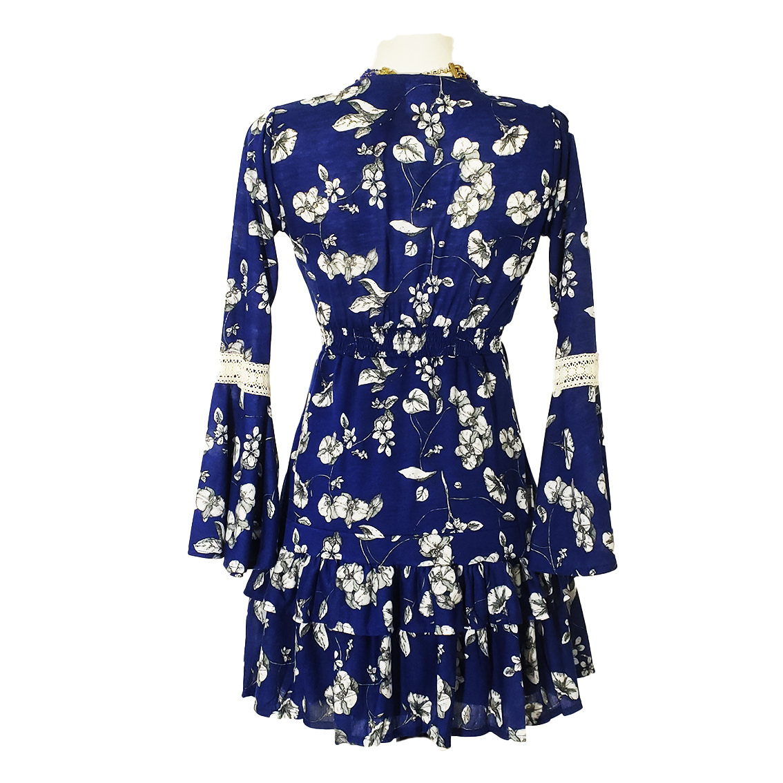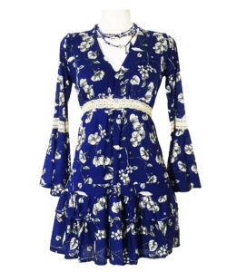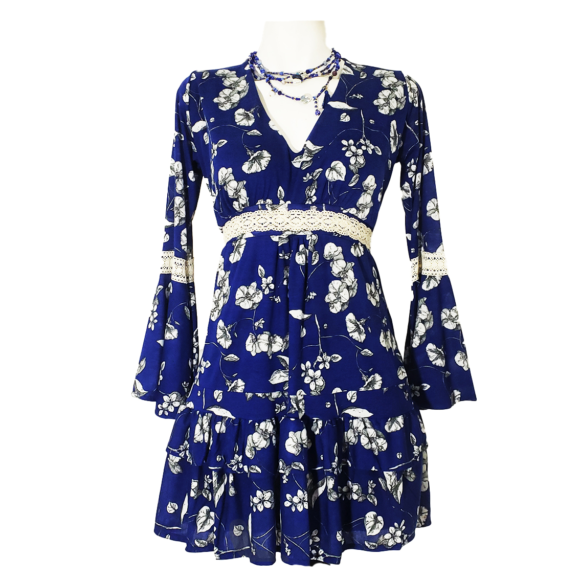 Vestido escote U estampado flores blancas y azules , manga larga textil suave , aplicacion de bolillo
