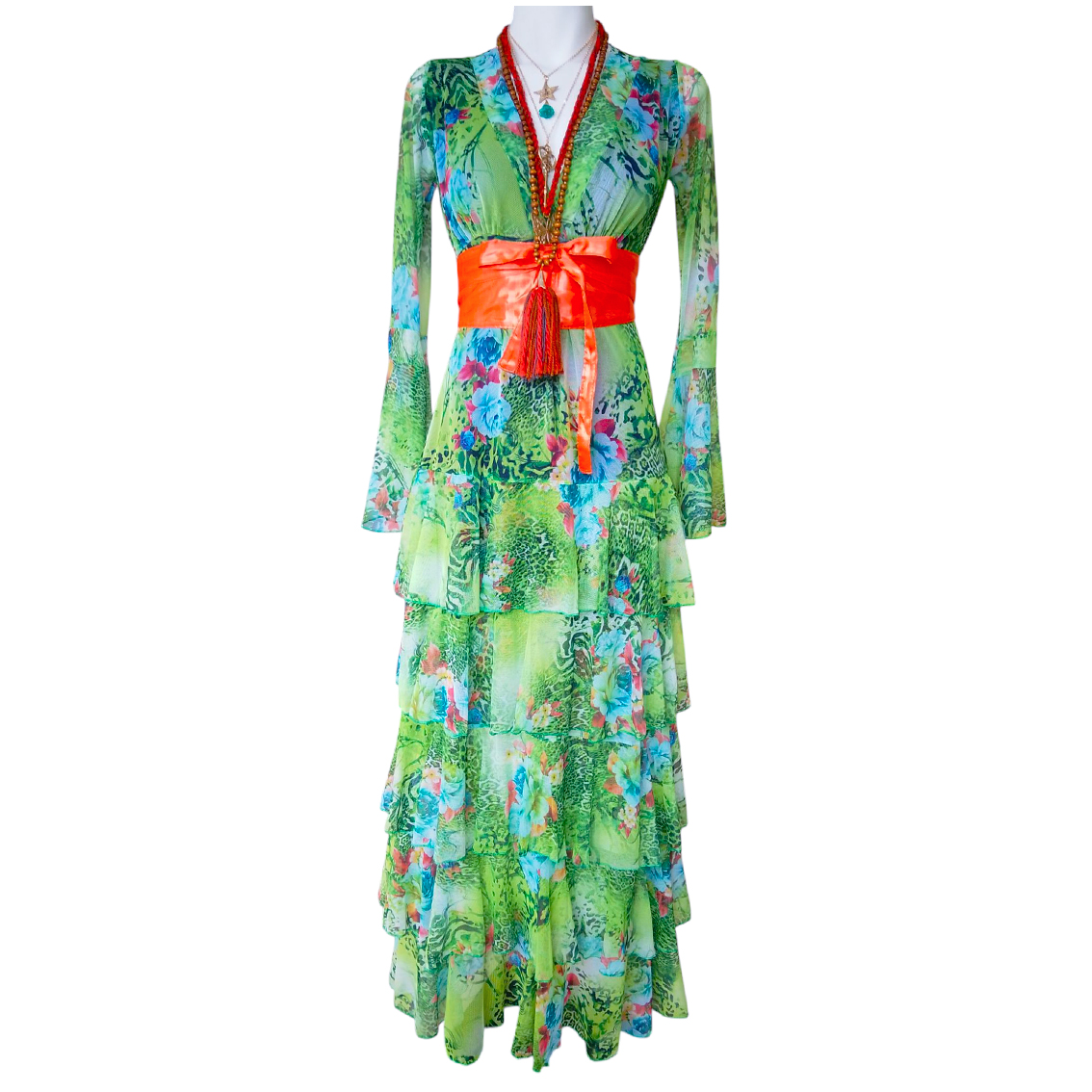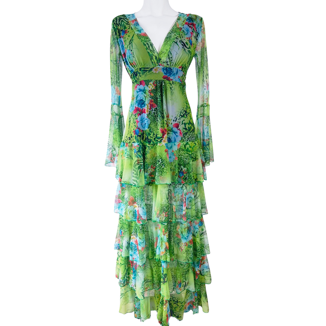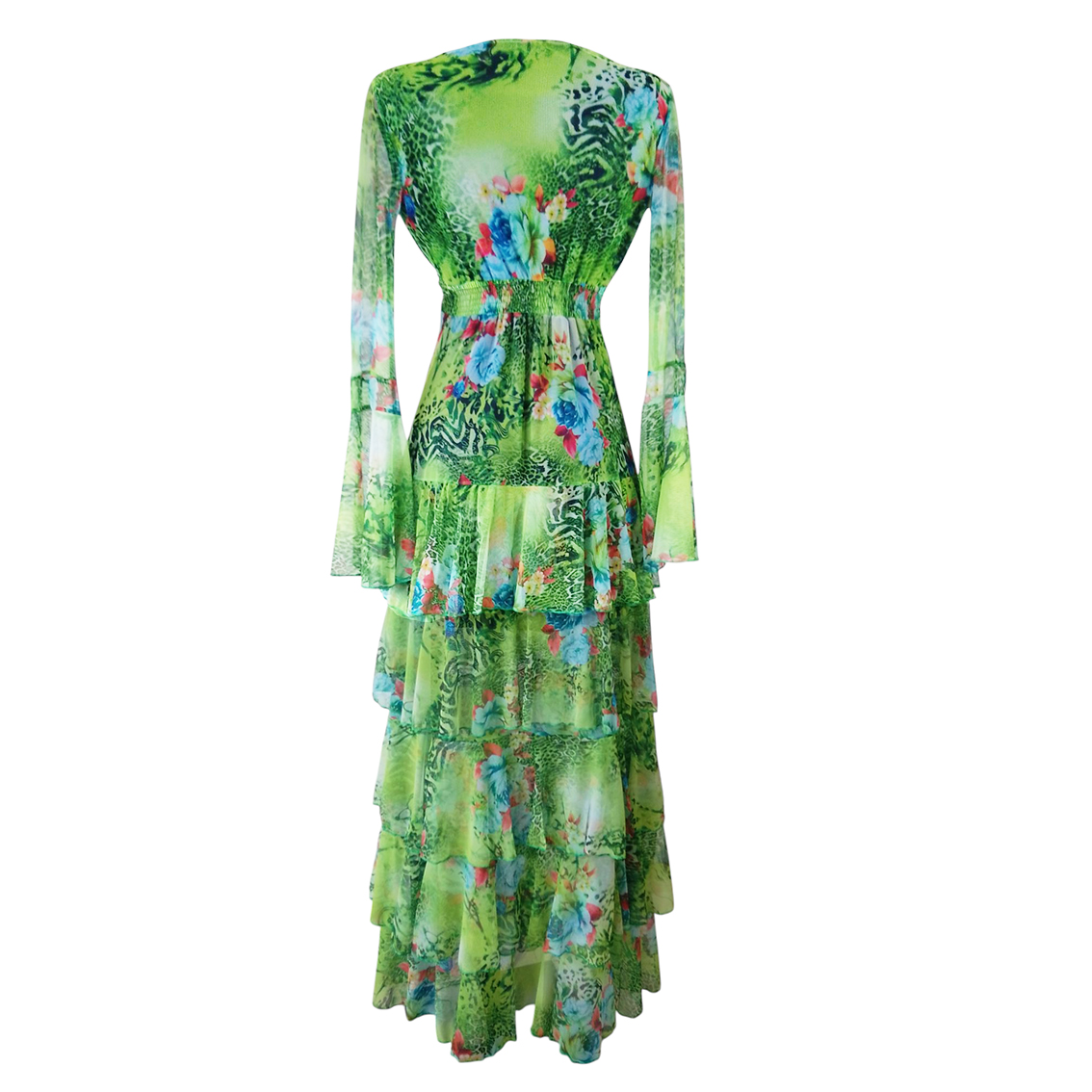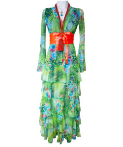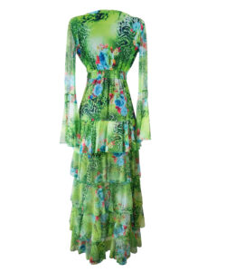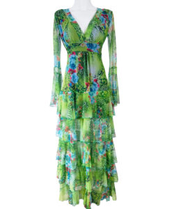 Vestido largo de olanes en faldón.