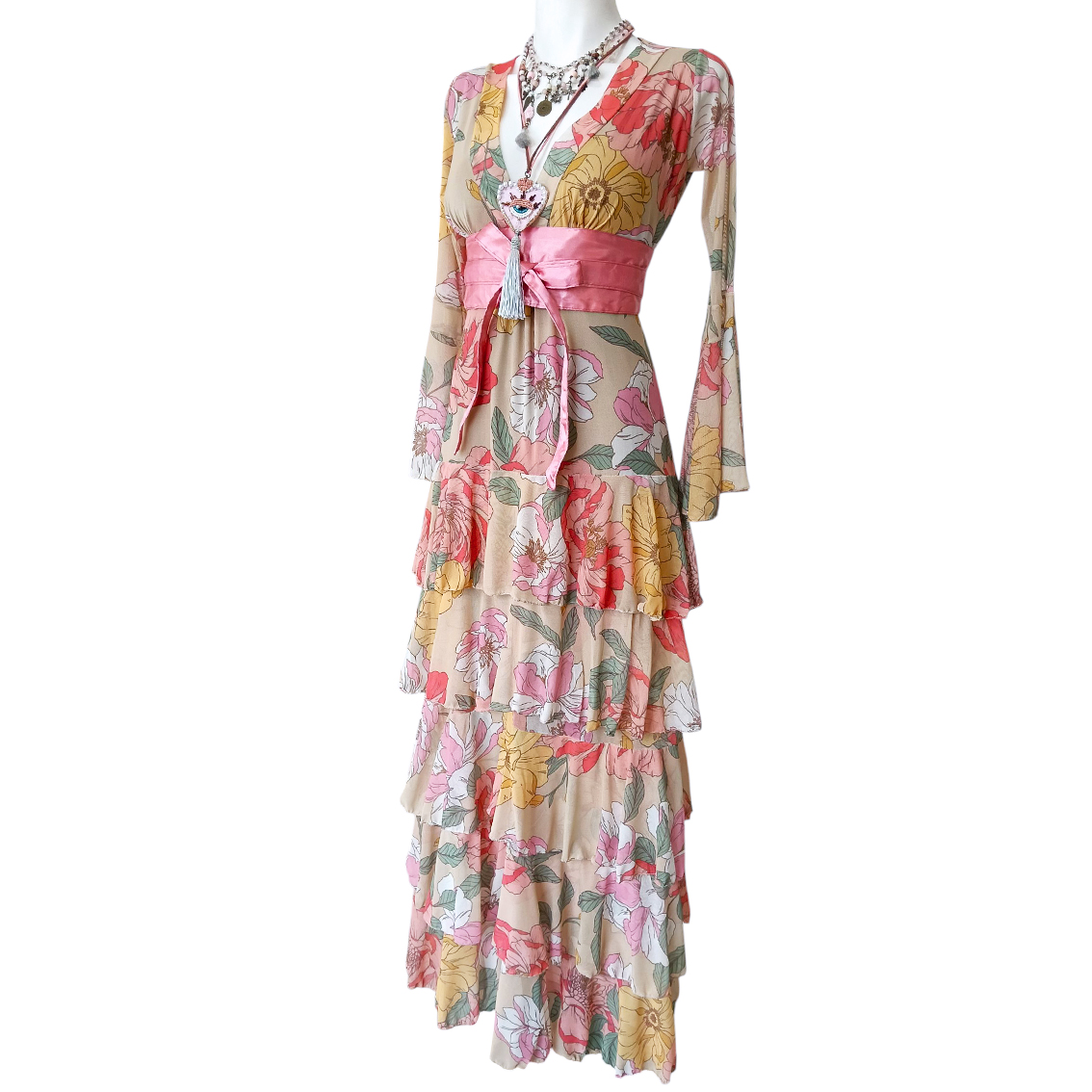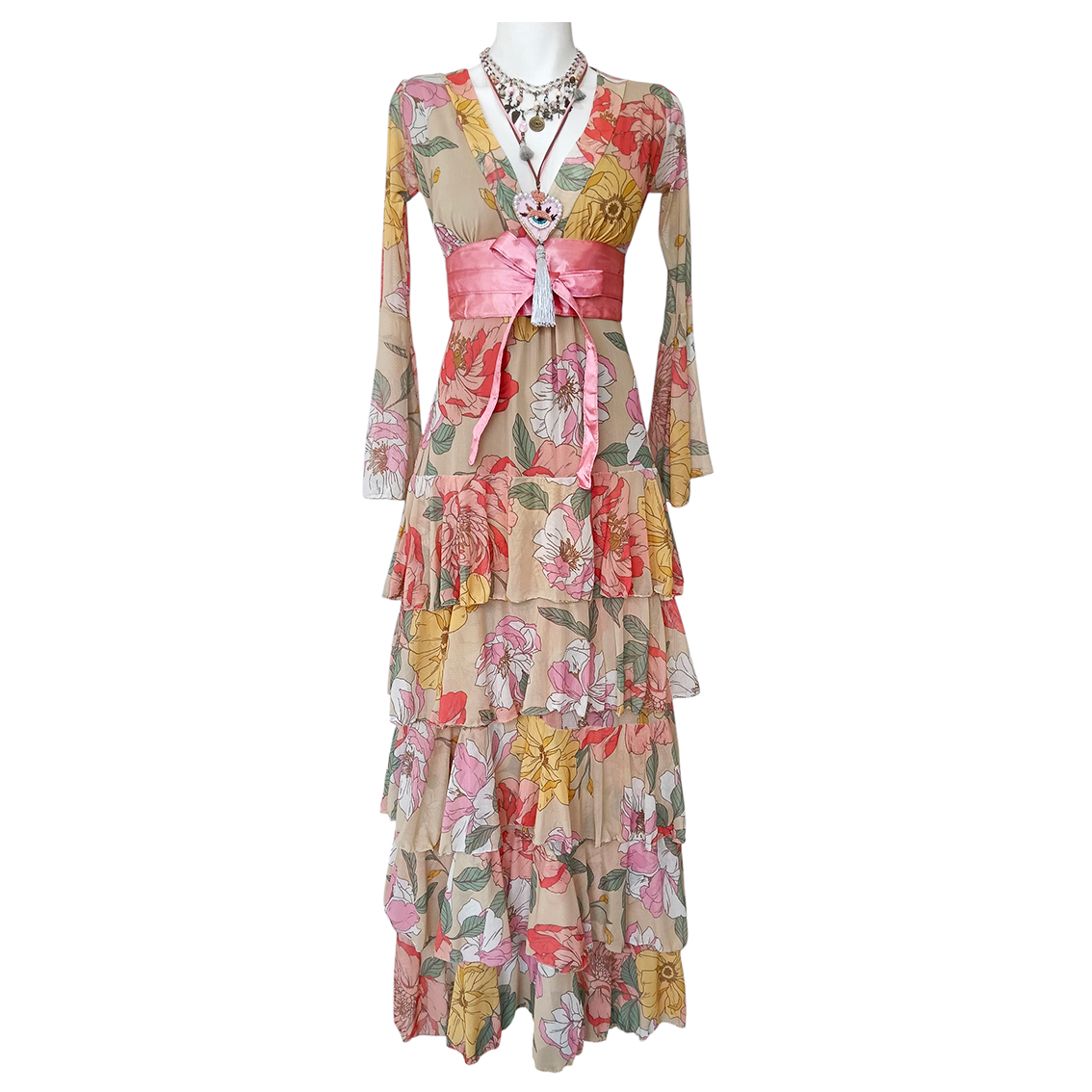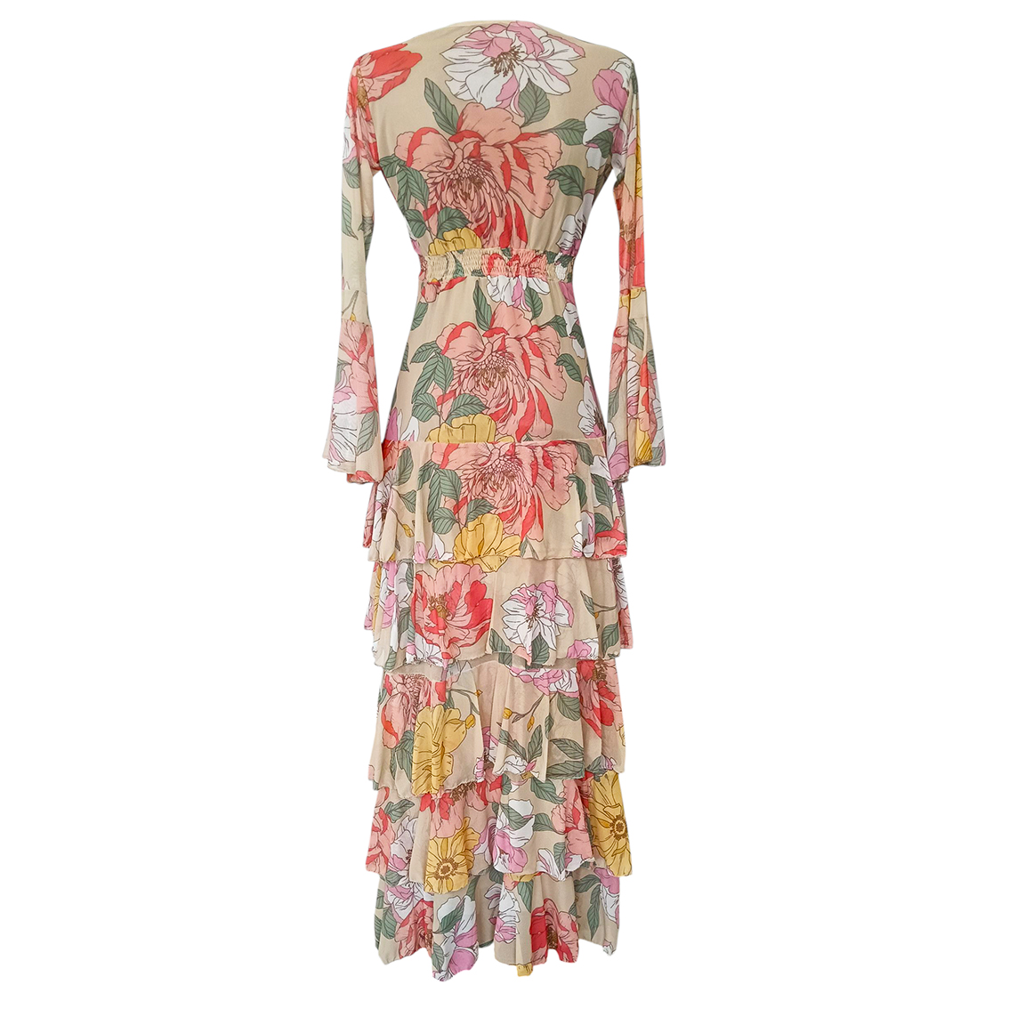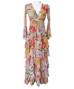Vestido largo de olanes en faldón.