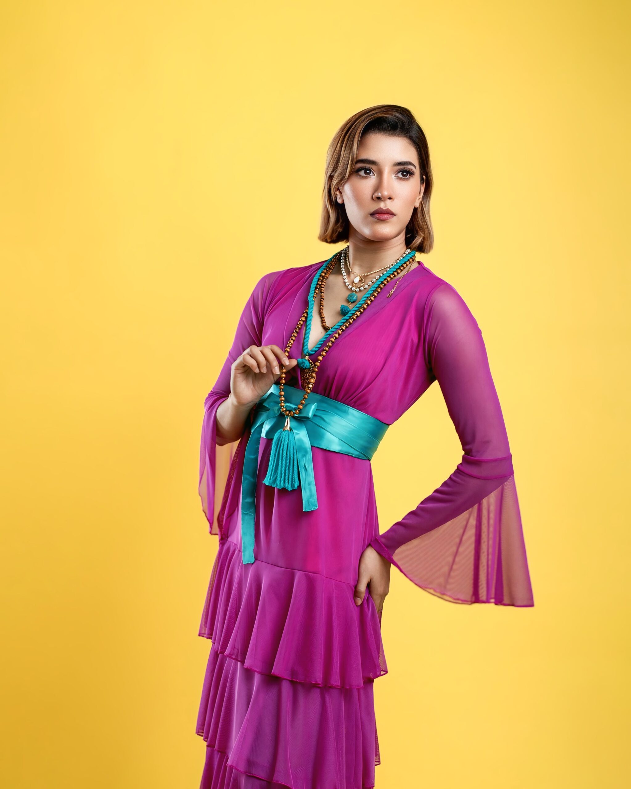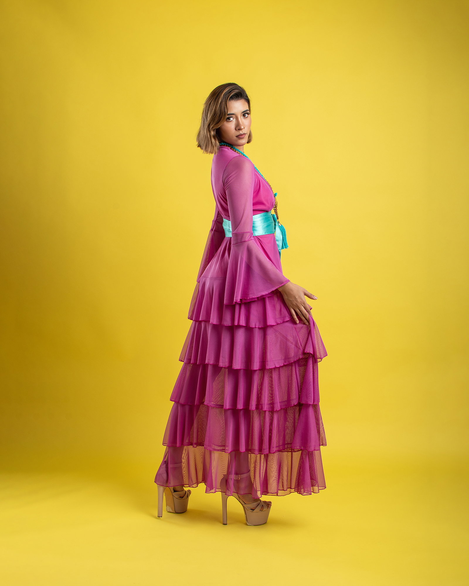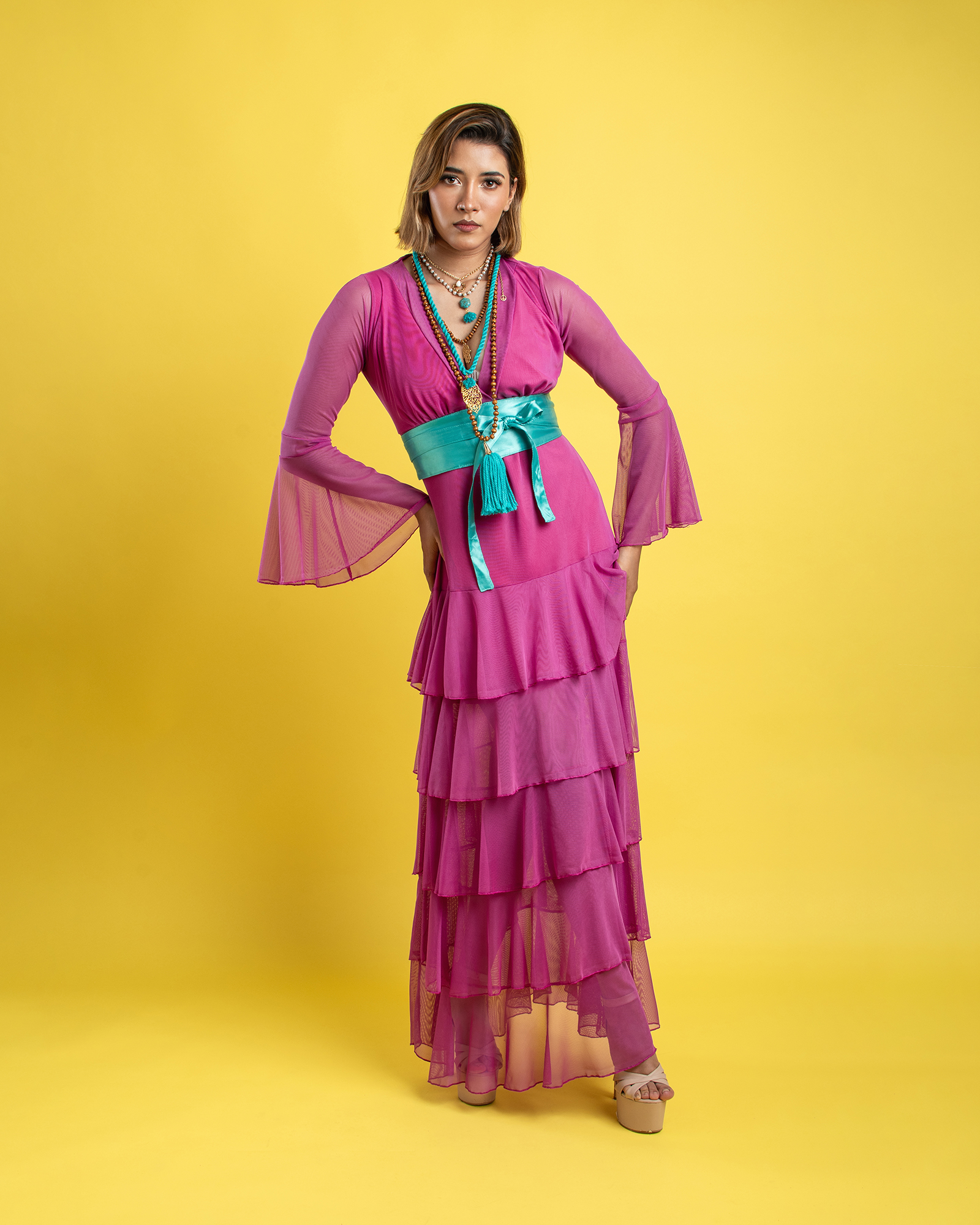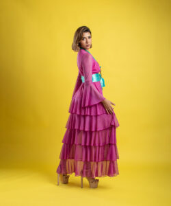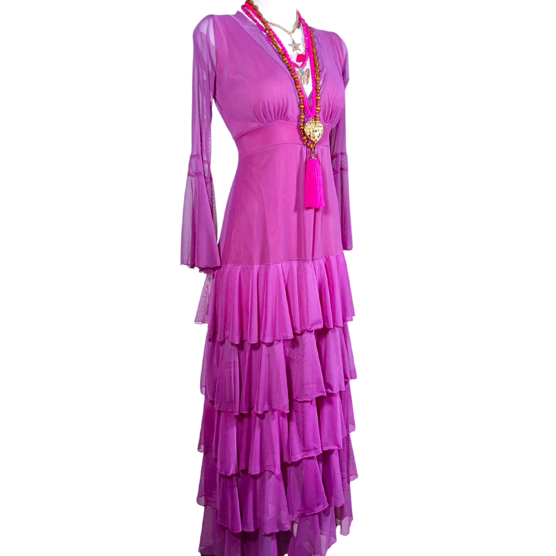 Vestido largo de olanes en faldón.