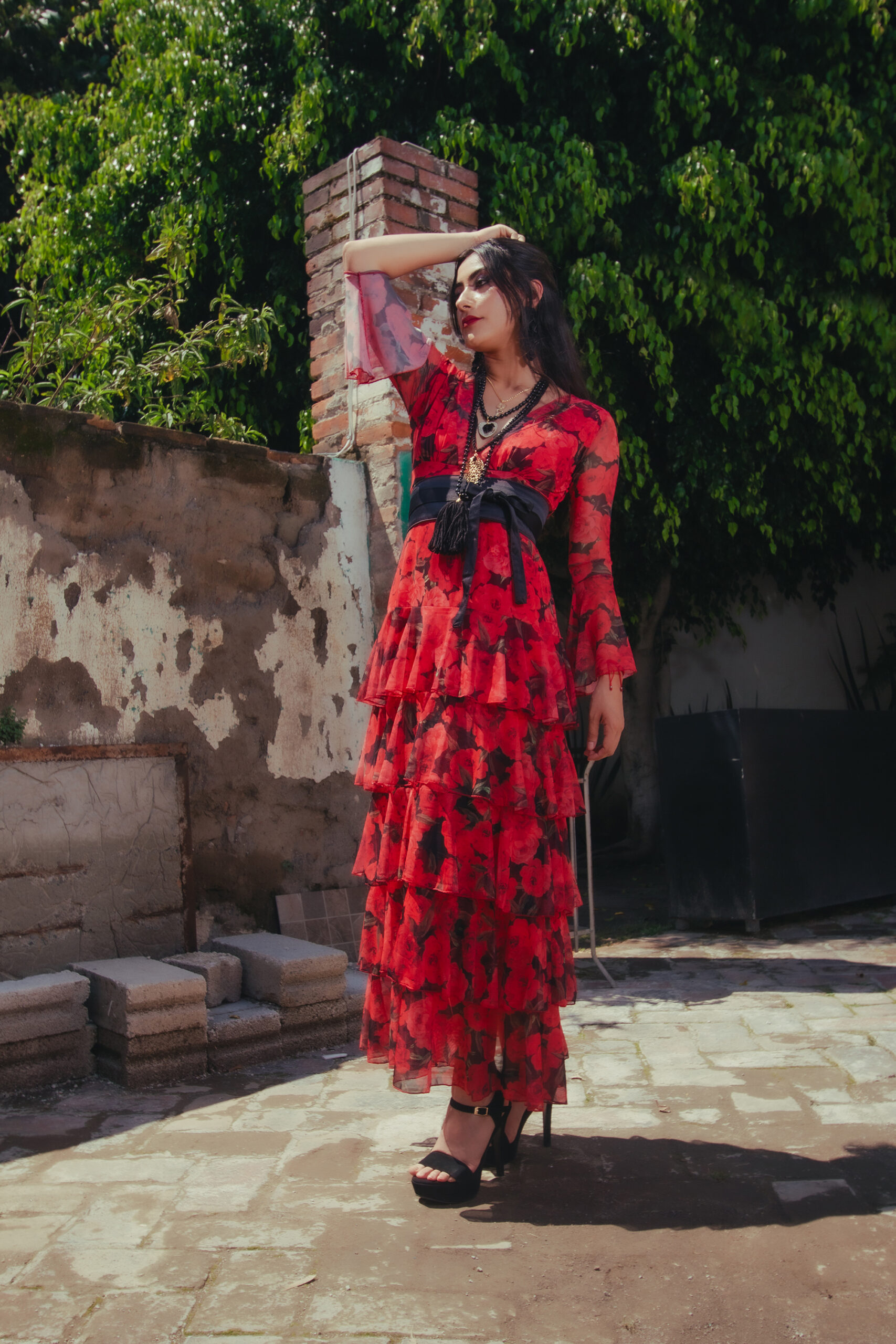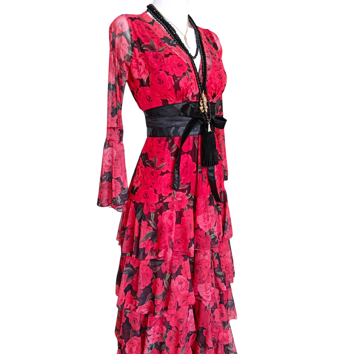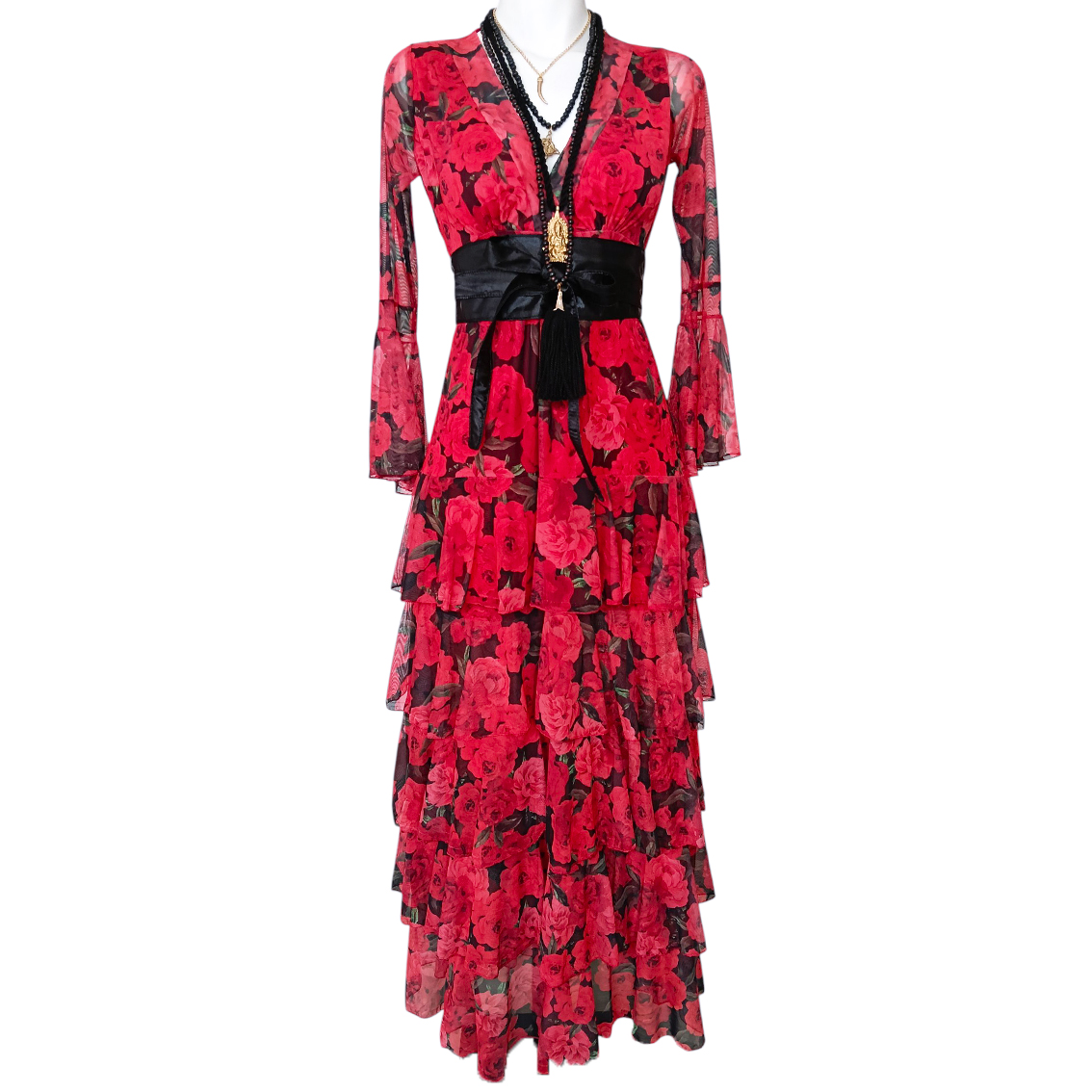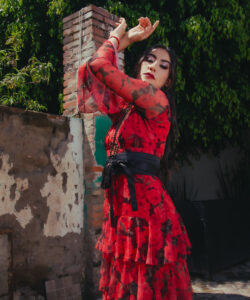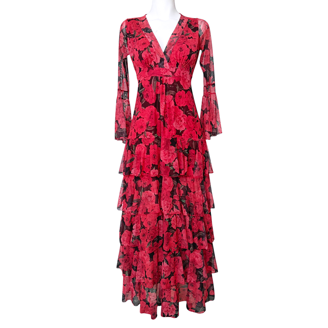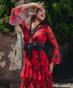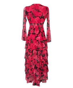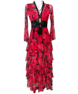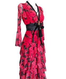 Vestido largo de olanes en faldón.