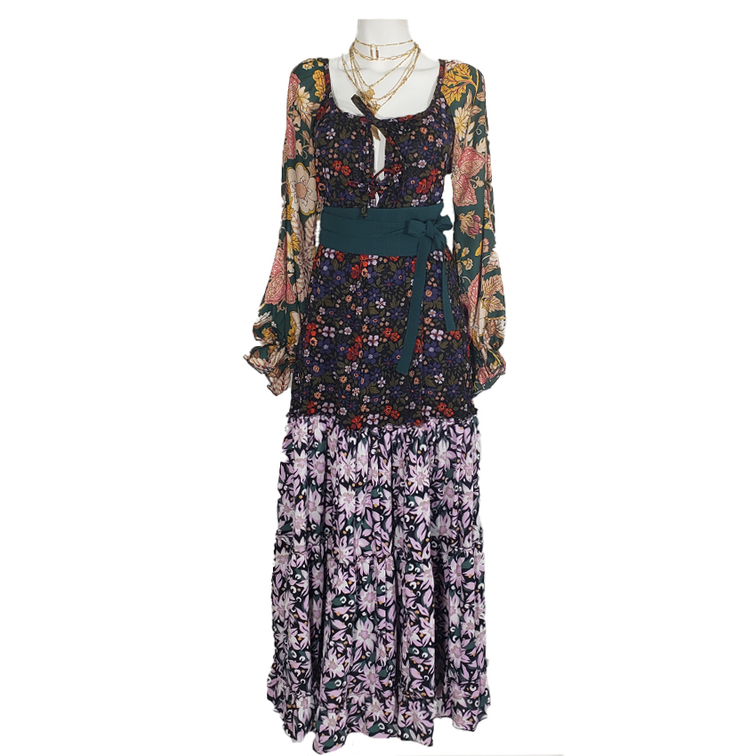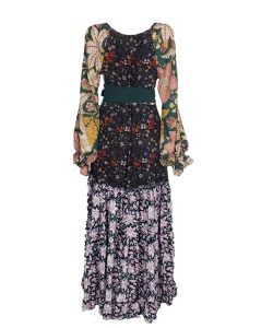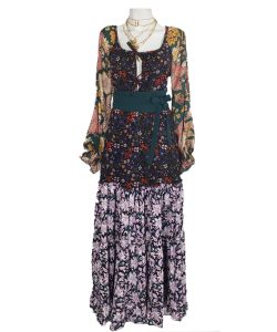 Vestido largo con falda amplia , mangas aglobadas , estampado flores diversas