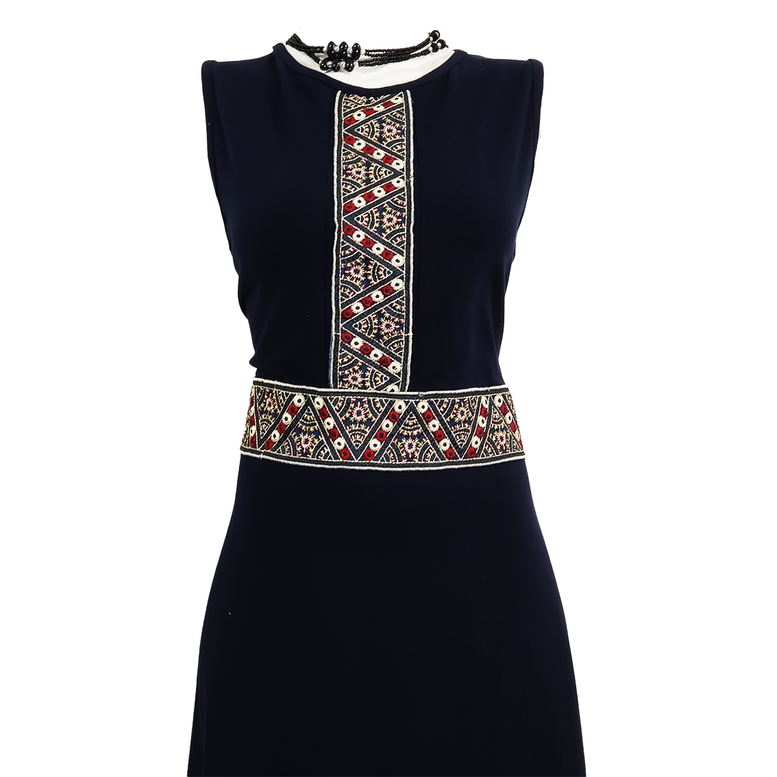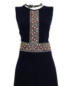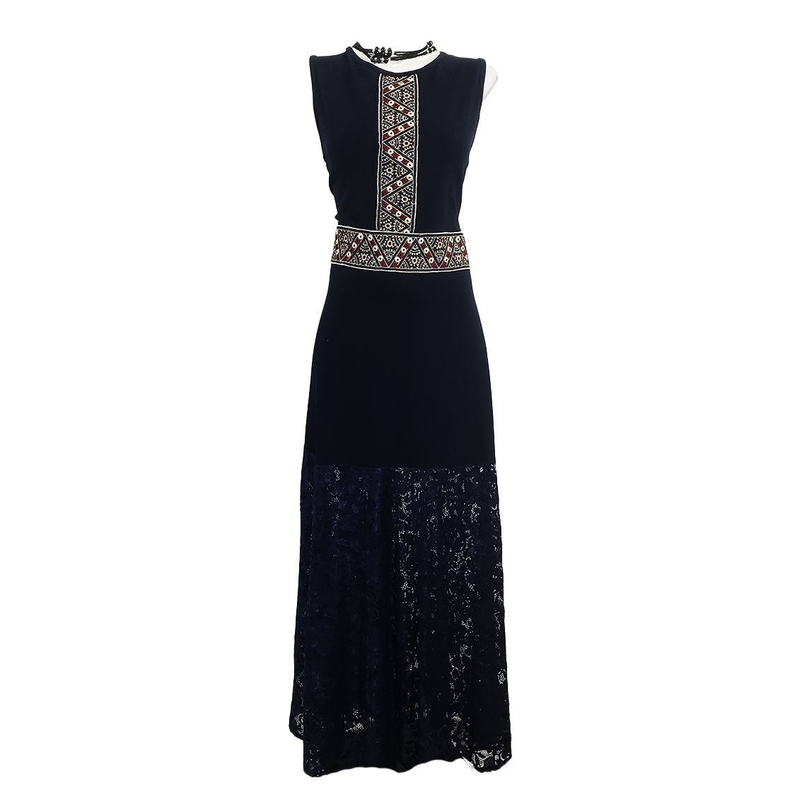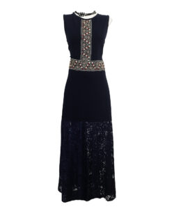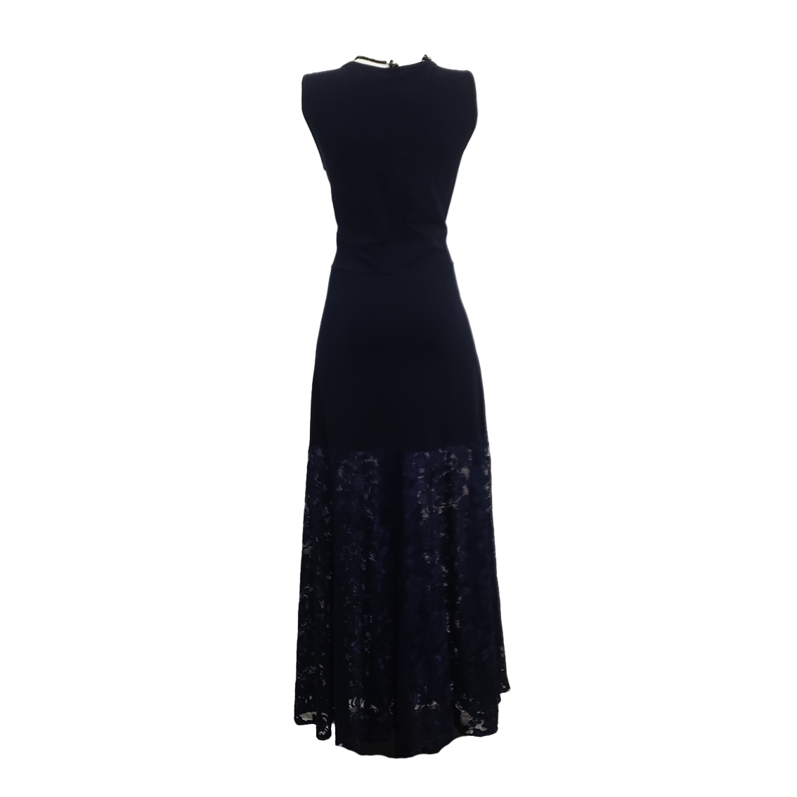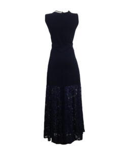 Vestido Largo sin mangas , color azul marino tela expandex, con detalle de croche