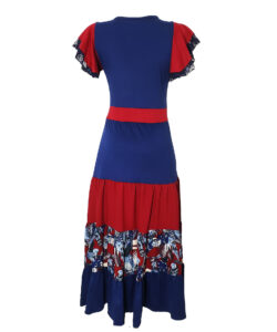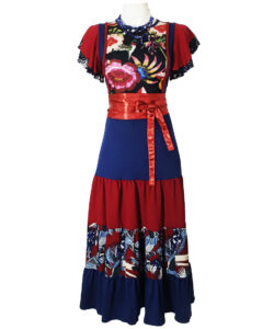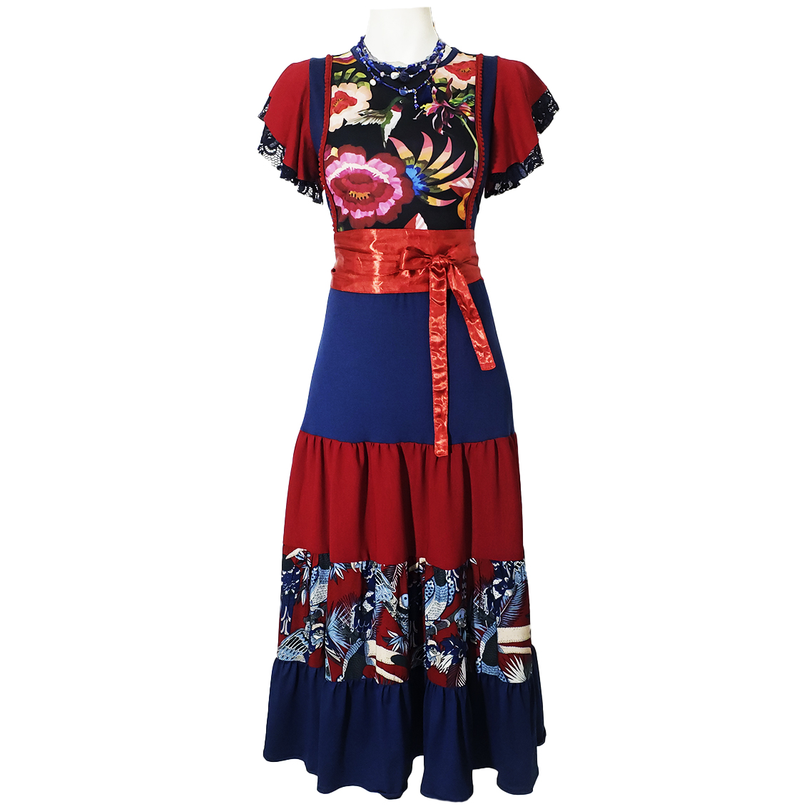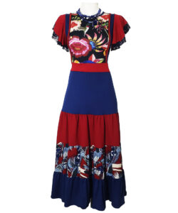 vestido largo , con diferentes estampados, pechera estampado colibri y manga corta olanes