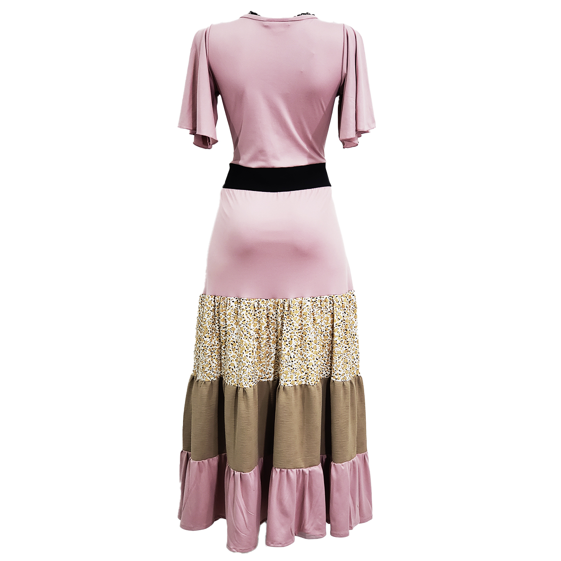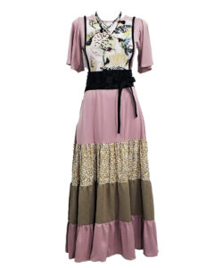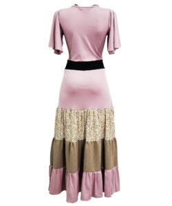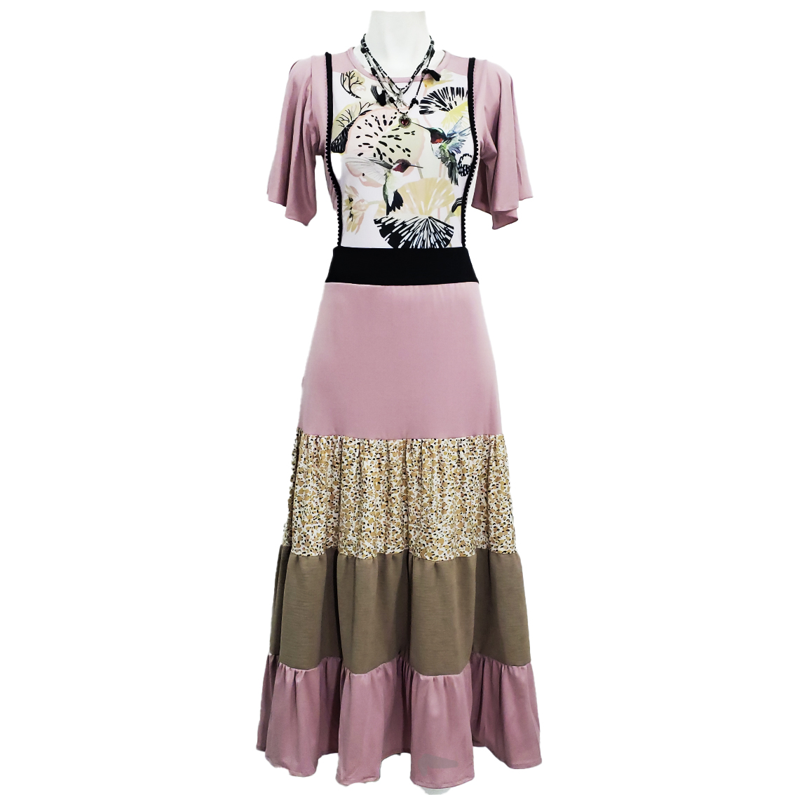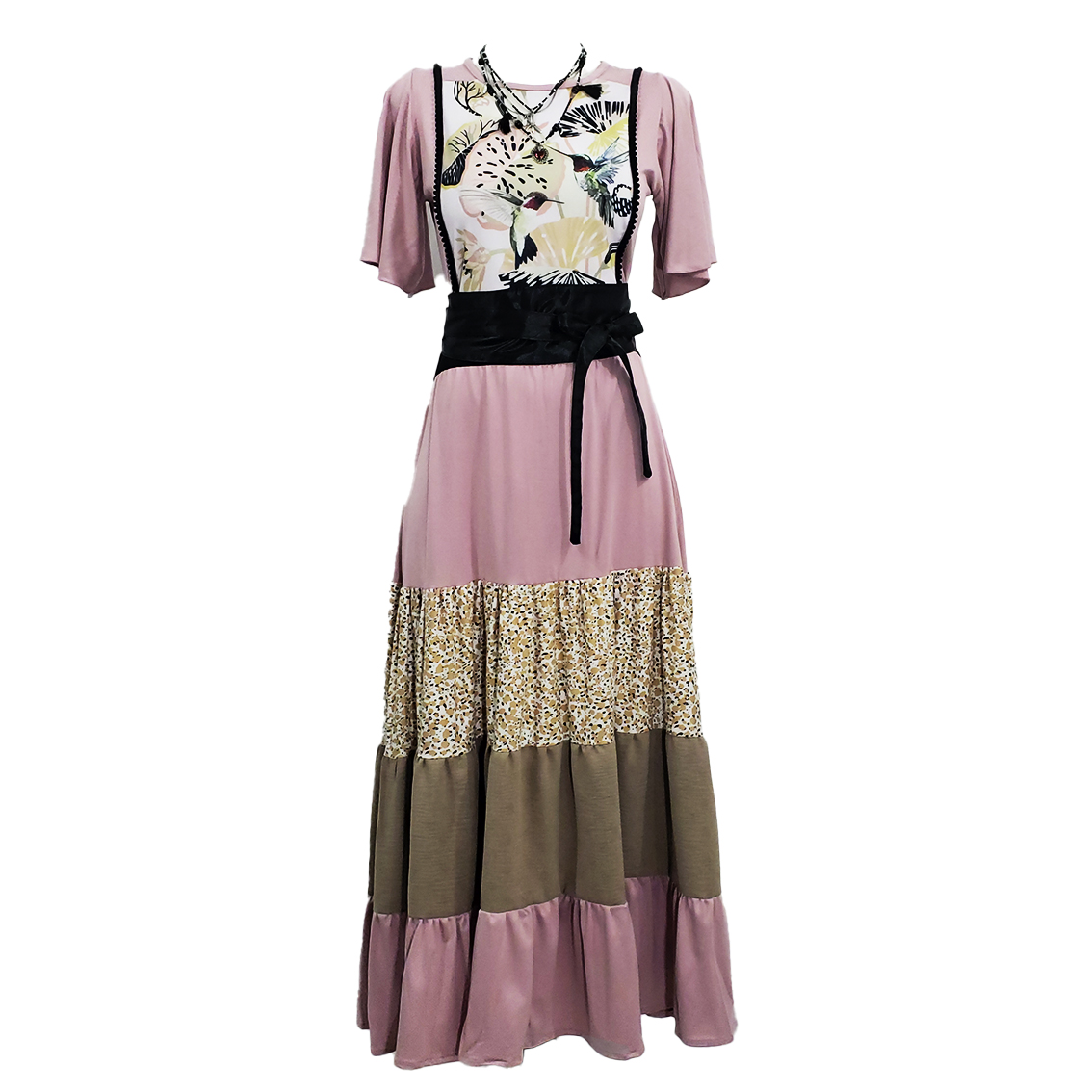 vestido largo rosita , pechera estampado colibri y manga corta olanes