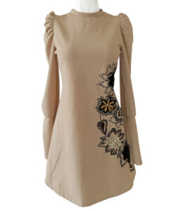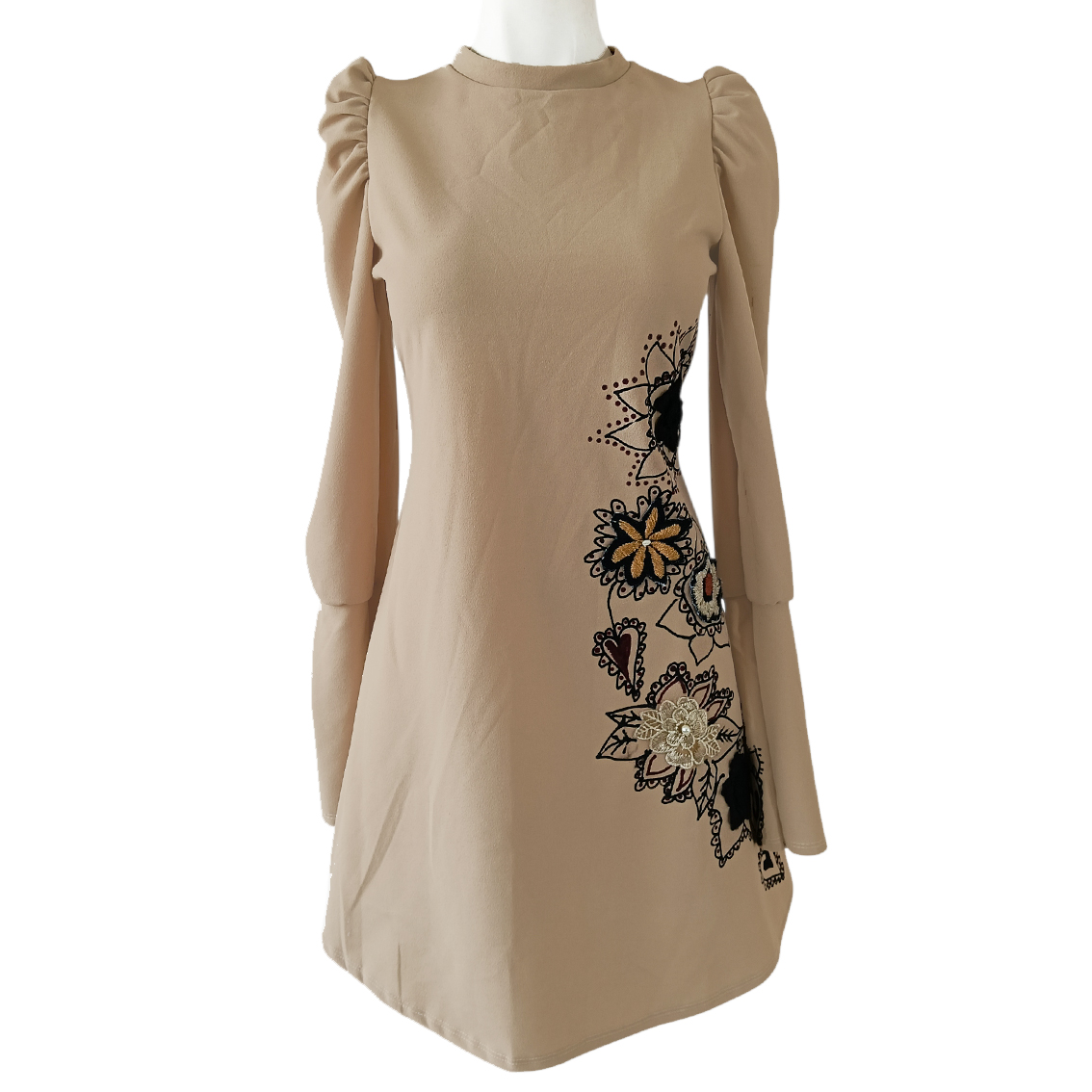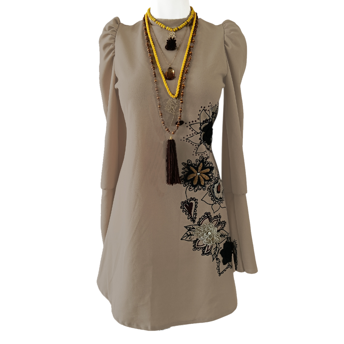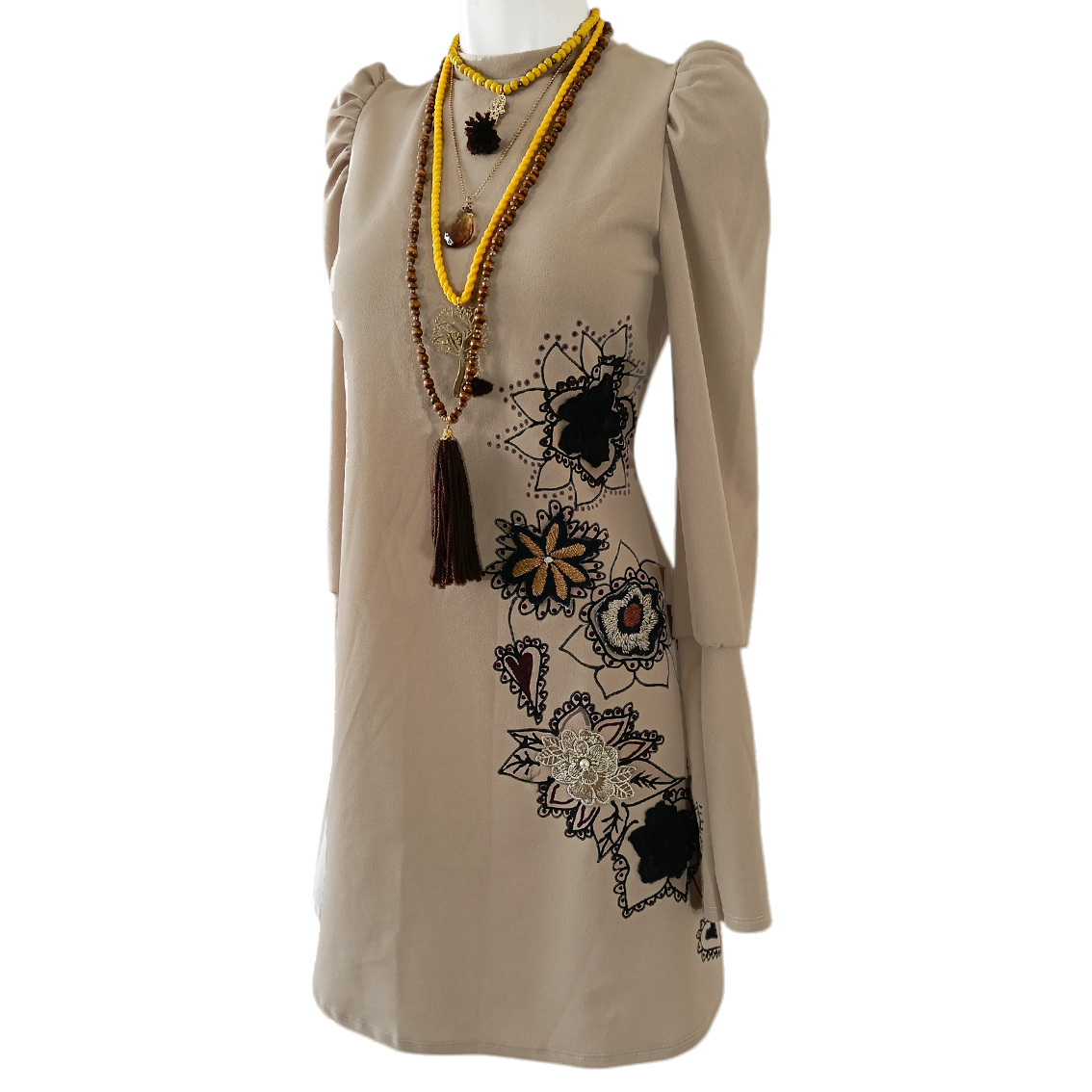 Aplicaciones pintadas y bordadas a mano.